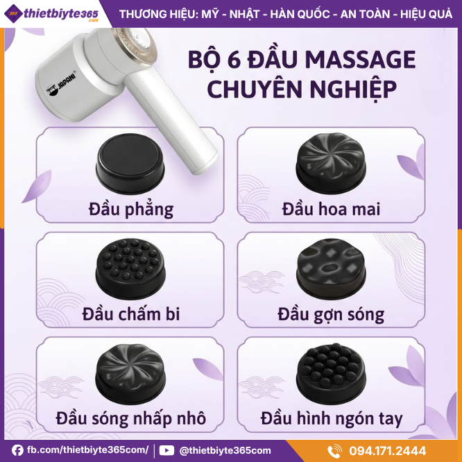 Điểm vượt trội của Máy massage cầm tay mini JAPANI MCT-4456 chính là bộ 6 đầu massage chuyên dụng đi kèm, đáp ứng trọn vẹn mọi nhu cầu: